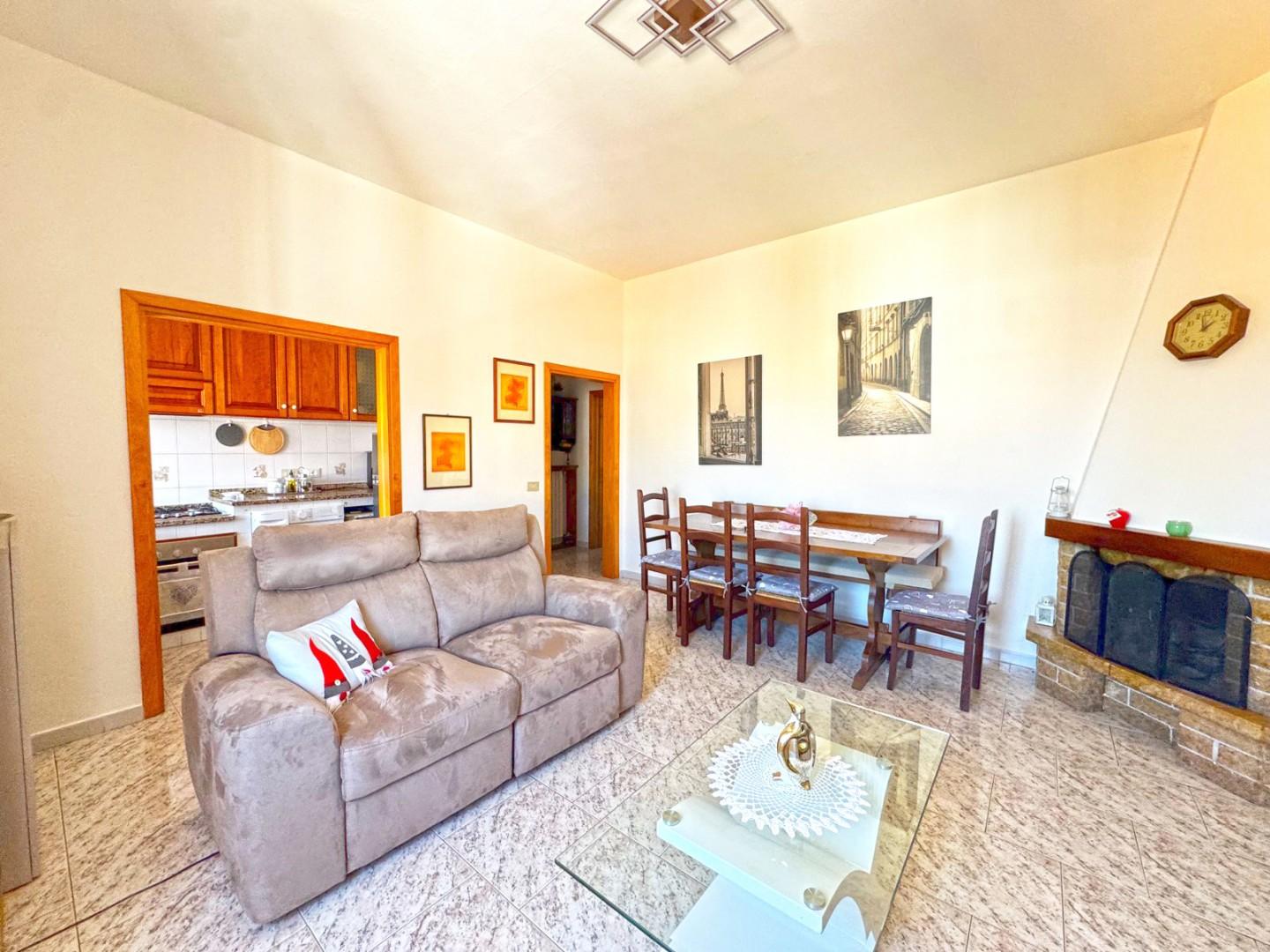 L’ingresso si apre su un luminoso soggiorno con angolo cottura, arricchito da camino e da due finestre che garantiscono un’ottima luminosità durante tutta la giornata.